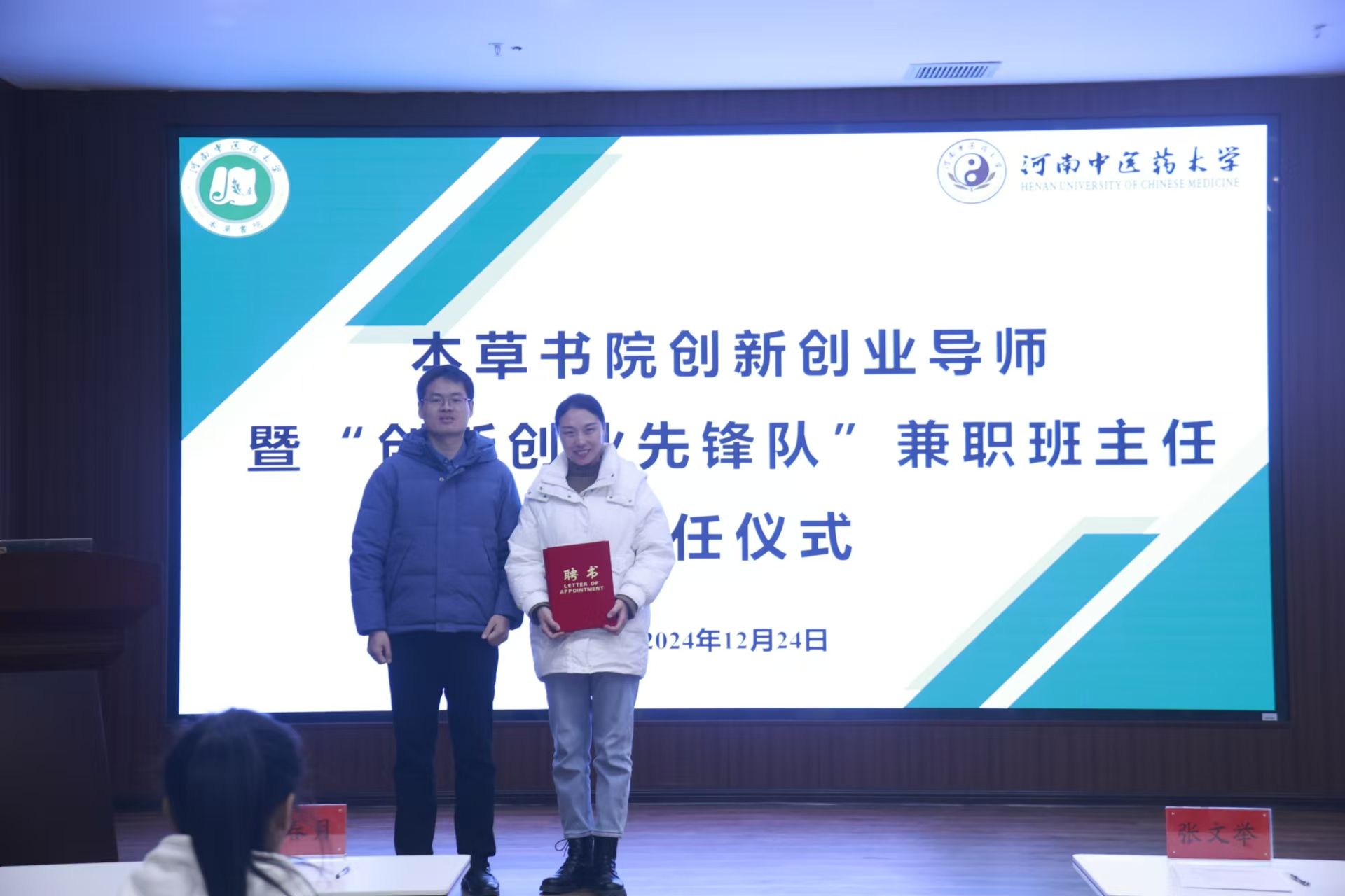 会上,张文举为创新创业导师暨“创新创业先锋队”兼职班主任胡春月颁发聘书。胡春月表示,被聘为创新创业导师既是一种荣誉,又是一种责任。她将结合自身所长,积极为书院创新创业工作提供有力帮助,共同助力提升双创工作水平;同时她也告诉同学们要积极思考,敢于创新,也要借助平台,整合资源,更要知行合一,转化成果。