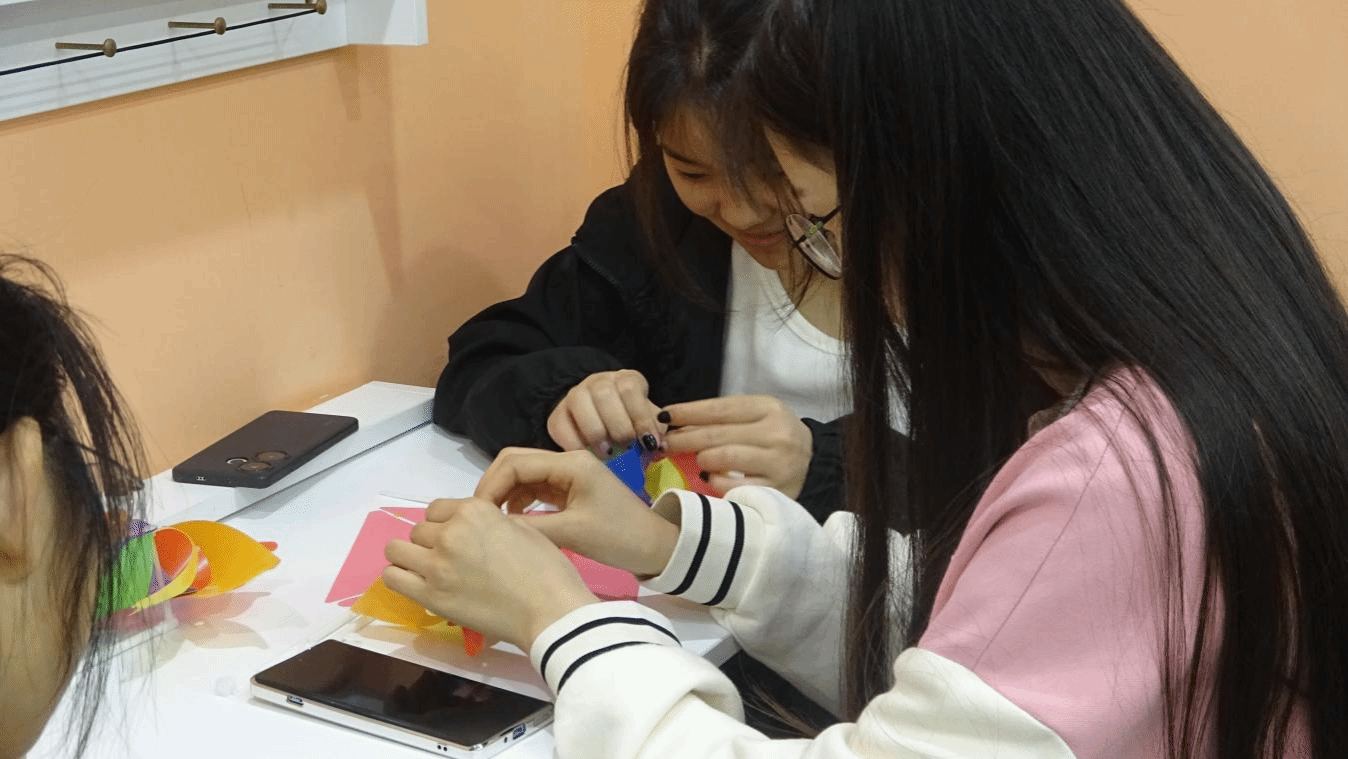 活动中,同学们纷纷在摆点处领取风车卡片,参与人员按照步骤进行折风车,根据现场工作人员的指引一步步完成风车的制作,大家相互交流折叠风车的技巧与心得,不知不觉间,一个个风车在手中生成。同学们将制作精美的风车安装在钢丝绳上,最后齐心协力固定在17k小说