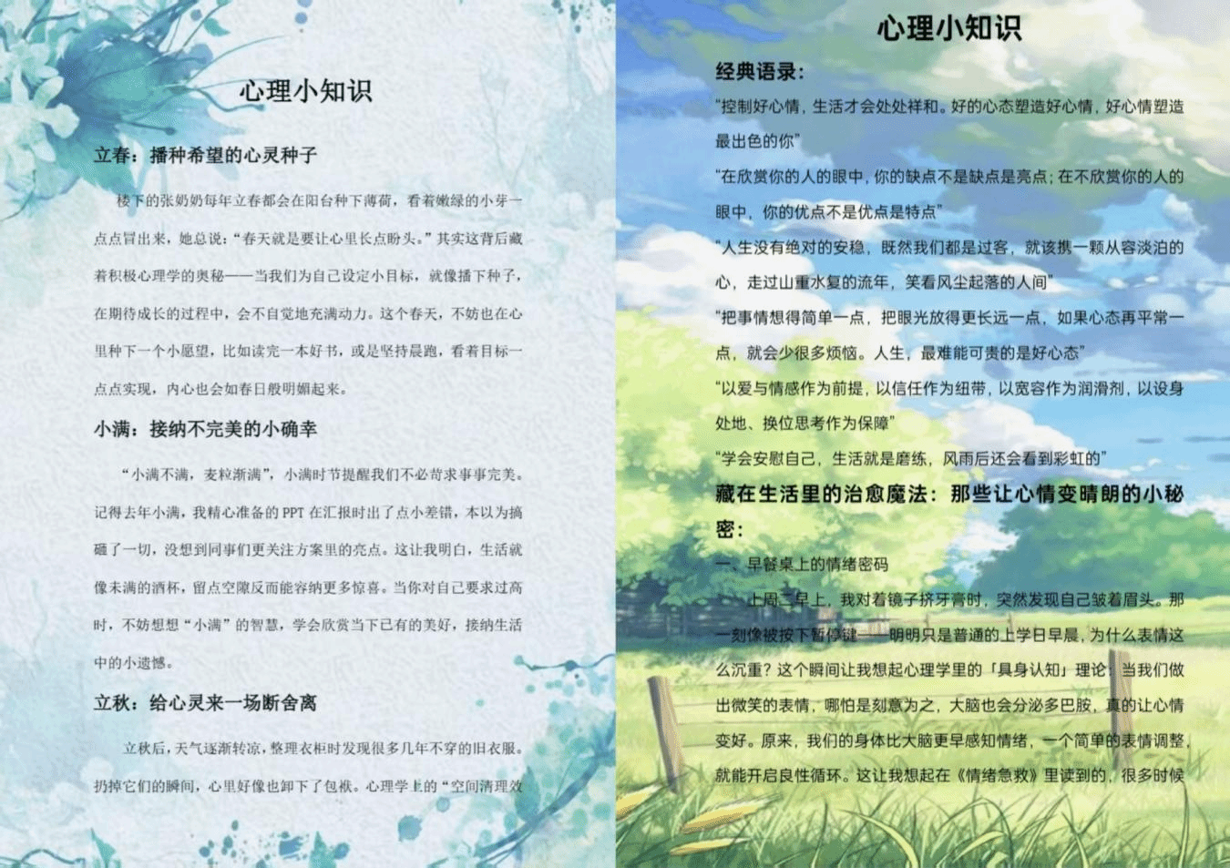 同学们热情高涨,作品收集及评分顺利工作顺利开展。在实用技巧方面,同学设计的“3分钟情绪降温法”、“考前番茄钟正念手账”等,将专业心理干预转化为可操作的日常行为;理论阐释类作品则展现创新思考,同学颠覆“木桶效应”,强调“发挥优势比弥补短板更能提升心理韧性”;更有同学以“节气-中药-心理”为三重线索,构建了本土化的心理健康调节体系,将《黄帝内经》“天人相应”理论与现代心理学原理结合,如大暑慢生活对应“暑当以静制之”的养生观,小暑自然疗愈契合“人与天地相参”的整体观;在形式上,通过“仪式感-处方-疗法-哲学”的递进结构,让专业知识变得通俗易懂。同学们能用名言解读生活,用故事诠释理论时,心理健康教育就实现了从灌输到共鸣的跨越。