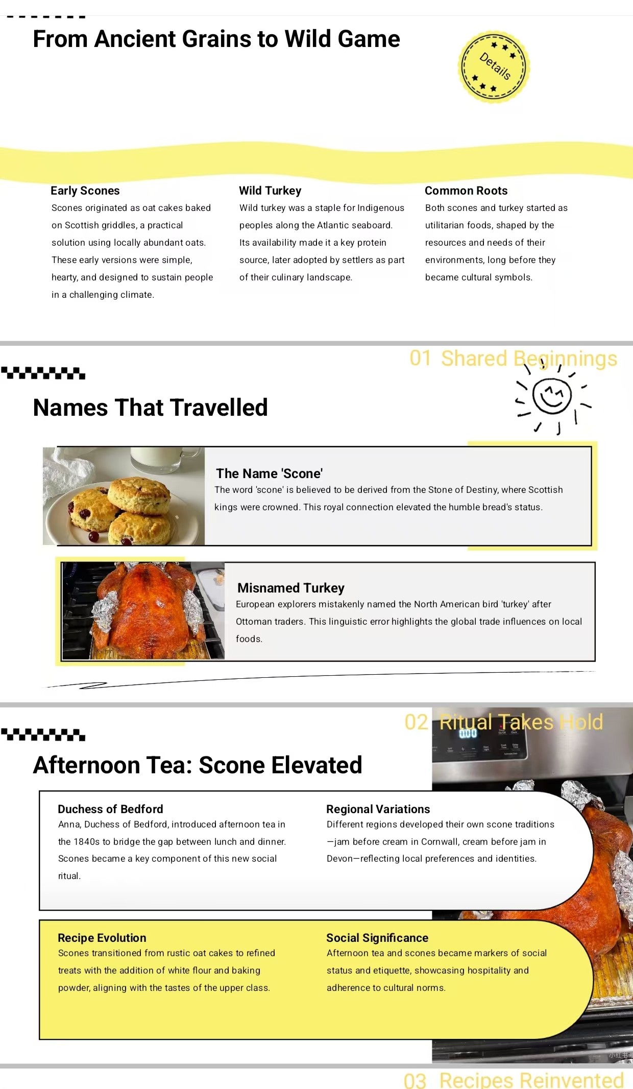 本次活动以“英式司康”与“美式火鸡”为文化切入点,鼓励同学们围绕英美国家代表性美食,通过PPT、配音视频或英语文稿等形式,从“起源与历史”“制作方法”“文化意义”三个方面展开研究与展示。参与者们在作品中融入创意与思考,有的以流畅英语配音搭配精美画面,生动还原司康在英式下午茶中的社交场景;有的通过图文并茂的PPT,梳理火鸡成为感恩节象征的历史脉络;还有同学撰写结构清晰的英语文稿,深入探讨美食背后的文化内涵。2024级药学本科班刘歌通过制作PPT来讲述“英式司康”与“美式火鸡”的制作与历史文化;2024级预防医学本科班徐伊涵用英文配音视频讲解了英式与美式的美食文化历史;2024级中西医临床本科二班张皓月以PPT形式讲述英式与美式的礼仪文化和历史。参与同学在搜集资料、撰写脚本、录制视频的过程中,逐步构建起对异国文化更立体、更真实的认知,增强了跨文化理解与包容意识。