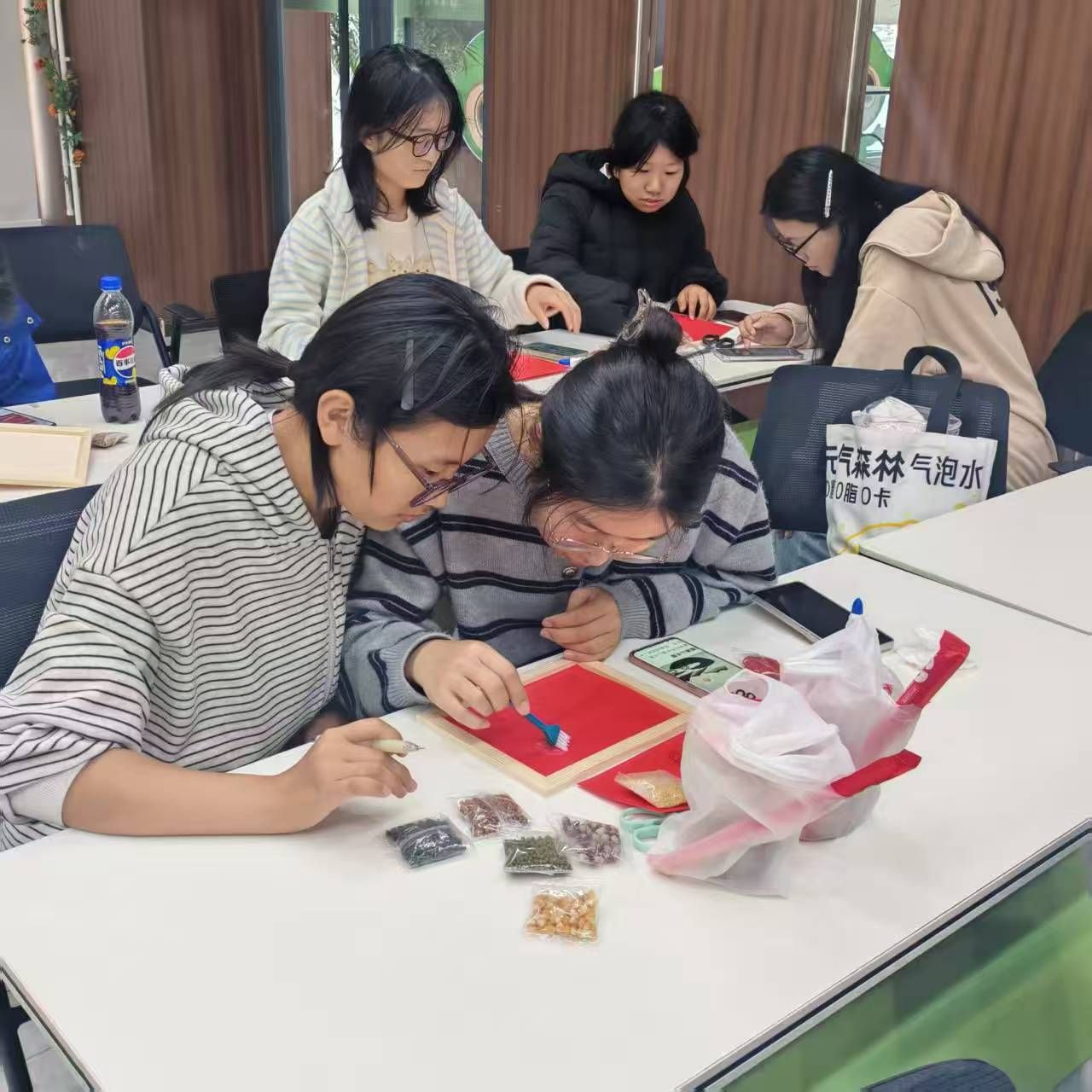 活动中,同学们热情高涨、积极参与,充分发挥想象力与创造力,运用多样的五谷材料,以匠心巧思绘就红色主题画卷。他们以五谷为笔、以草木为墨,将传统与创新融为一体,生动诠释了青年学子对党和祖国的真挚热爱。作品中,有以中国地图为背景、用五谷描绘锦绣河山的宏大构图,也有以标志性建筑为主线、展现祖国繁荣昌盛的细腻画面。其中,乔兵霞、吉欣华小组的作品构图精巧、色彩鲜明,以五谷粒粒铺就巍峨长城,寓意民族精神坚韧不屈,荣获本次活动一等奖。