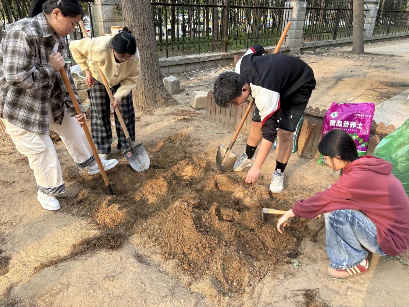 顺应农时,深耕沃土。惊蛰之后,气温回升、雨水增多,土壤解冻。在朋辈同学的带领下,学生们手持锄头、铁锹,首先对土地进行了深翻与碎土,并按《齐民要术》中的古训:“顺天时,量地利,则用力少而成功多。”随后,对不同药材的种植规划了分区,同学们便俯身田间,细心地将山药种块按株距一一排布,覆上松软的泥土,再轻轻按压,让种块与土壤紧密相依;把趁着春分温润的好时节移栽的菊花苗,按二十厘米的行距定植,再为它们浇透定根水,盼着早日扎根生长;接着开出两厘米深的浅沟,将板蓝根与紫苏的种子均匀播撒入土,播后稍稍镇压,等待萌发。