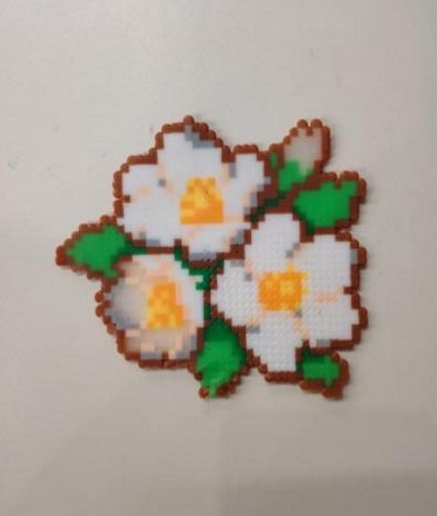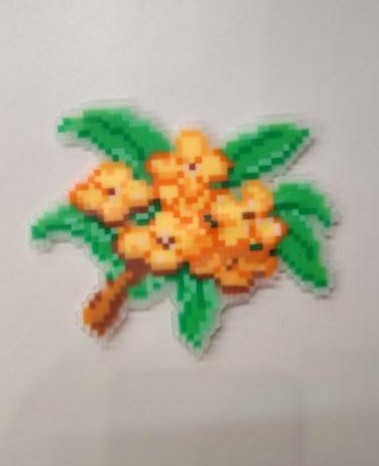 的清芬气韵,更在方寸之间展现出花卉本真之美,将审美价值与中医药文化内涵完美融合,尽显匠心。2024级邵佳音、孙莹莹同学的作品《桂花》斩获二等奖,她们用黄色与橙色的拼豆层层铺排出桂花饱满而富有层次的花瓣,鲜绿的叶片与棕色的枝干相互映衬,整体构图干净清爽,手工细腻精巧,将桂花小巧可爱的形态拿捏得恰到好处,既呈现出17k小说
