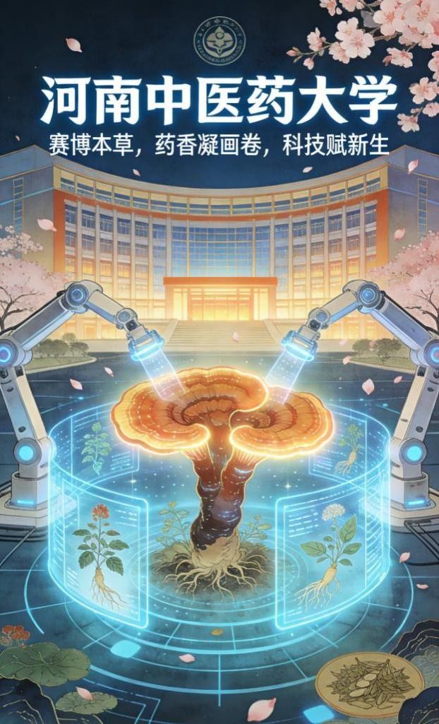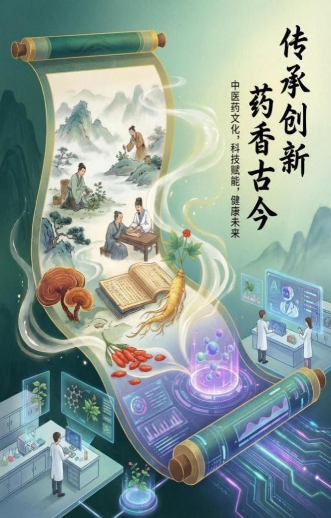 元素;右侧则展现现代实验室场景,通过科技界面与分子结构呈现中医药现代化研究,实现了传统意境与科技感的自然衔接。2025级中药学类三班张鑫雅以灵芝为核心,用机械臂与全息17k小说