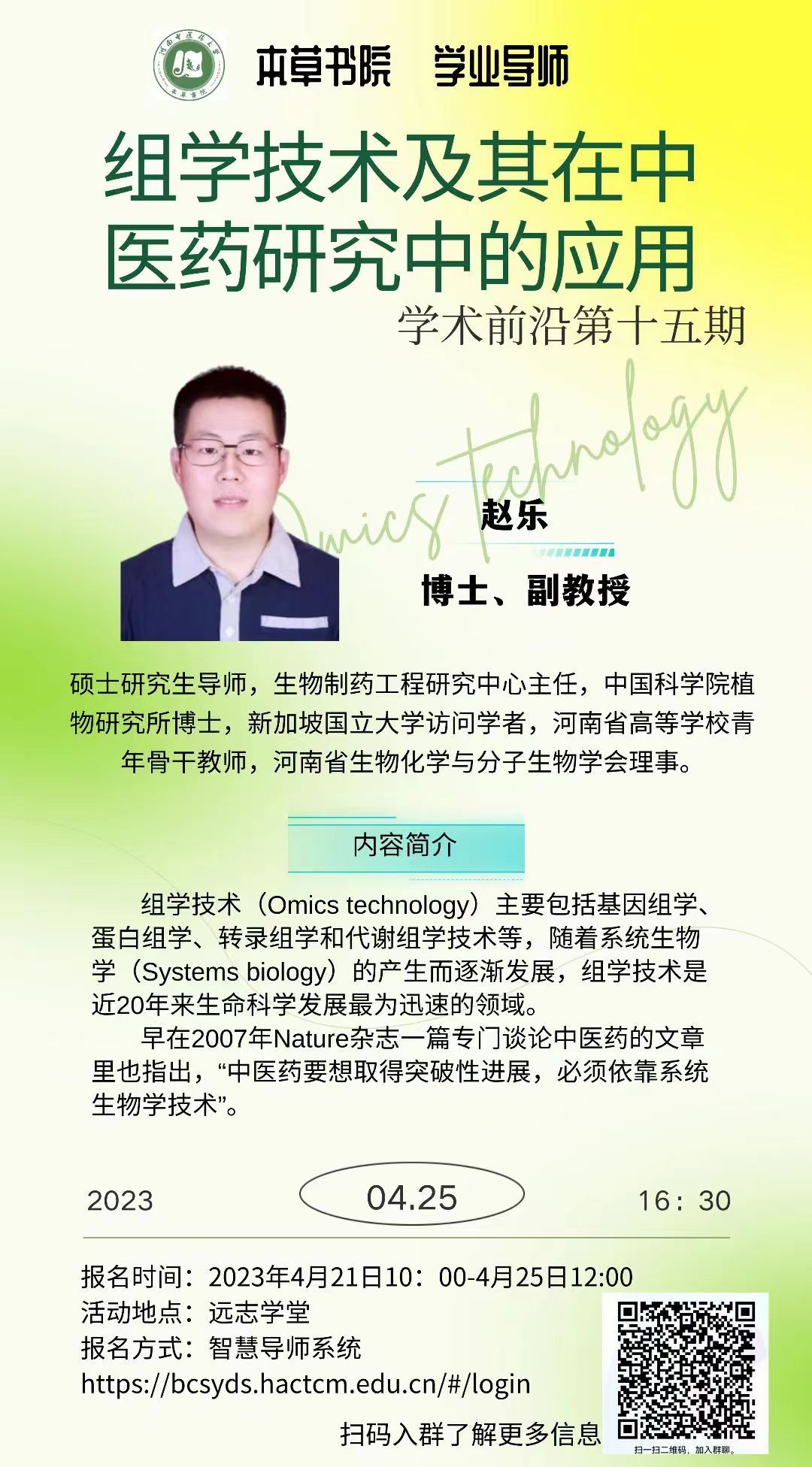近些年来,随着系统生物学的产生,组学技术迅速发展。组学技术主要包括基因组学、蛋白组学、转录组学和代谢组学技术等,可从不同层面解释生命活动的复杂性。伴随着中医药的发展,组学技术目前已应用于全面了解人类健康与疾病的关系和解析中医药治疗疾病的分子机制这两方面。为深入了解组学技术,学习其在中医药研究中的应用,学术前沿第十五期我们邀请到了赵乐老师为大家讲解。