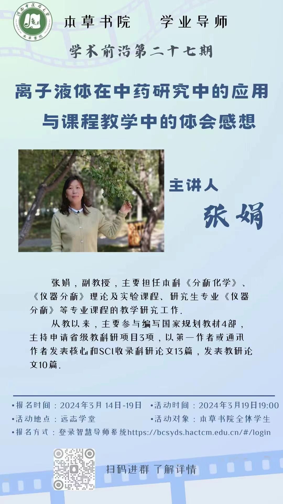 本次活动旨在向同学们科普离子液体在中药研究中的应用方面的知识,帮助同学们开拓视野,增强前沿意识,丰富知识体系,激发同学们的学习兴趣和求知欲,为同学们今后的科研奠定良好基础。同时帮助同学们提前了解分析化学、仪器分析课程的相关信息,为今后的学习奠定基础。