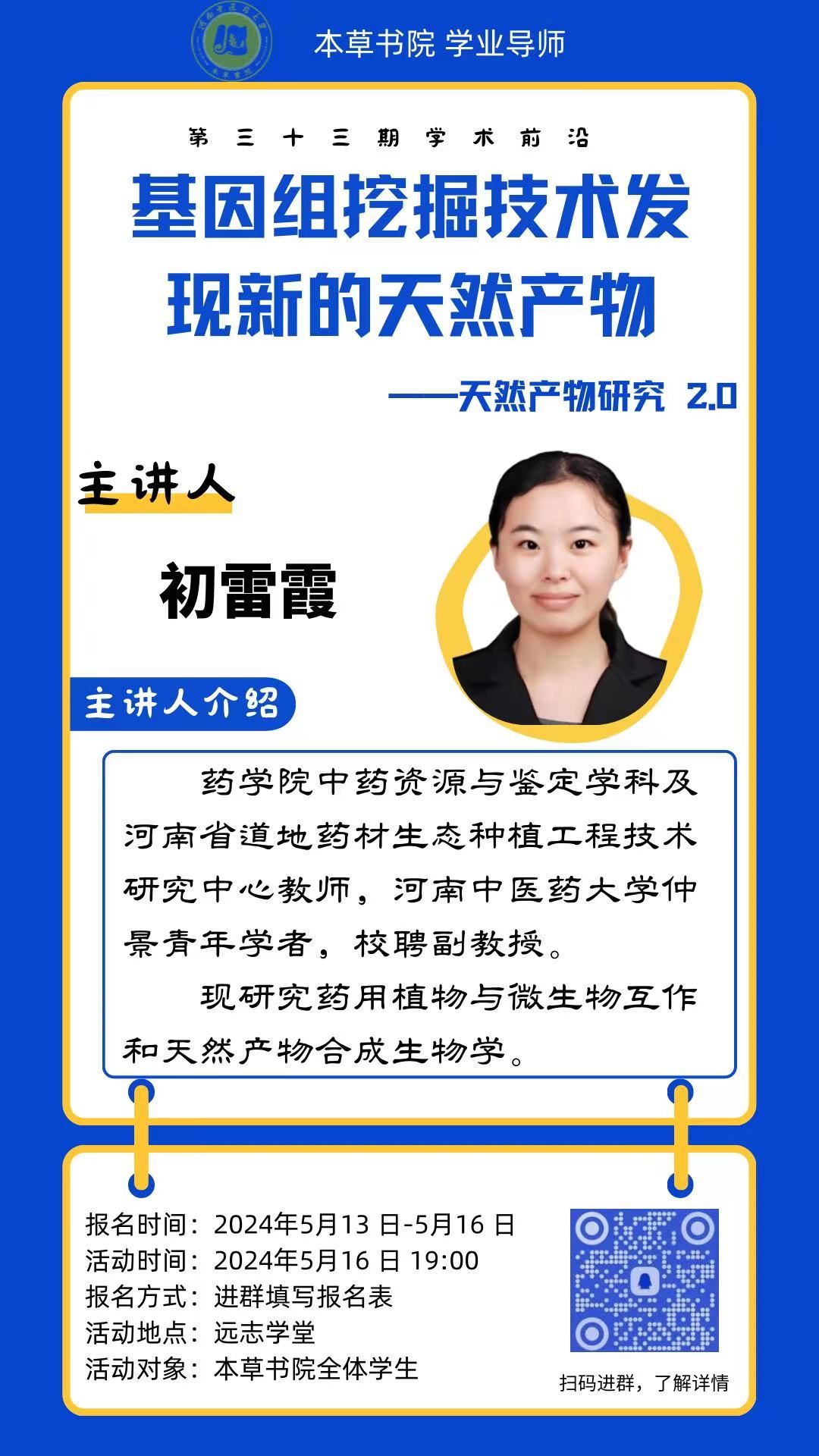 在生物技术革新的浪潮下,天然产物研究正迈向2.0时代。基因组挖掘技术以其独特的优势,为发现新的天然产物及其合成途径提供了强大工具。为使学生了解这一前沿技术,特举办“基因组挖掘技术发现新的天然产物”讲座。本次讲座旨在凝聚学生关注,激发科研热情,共同探索天然产物研究的新领域。