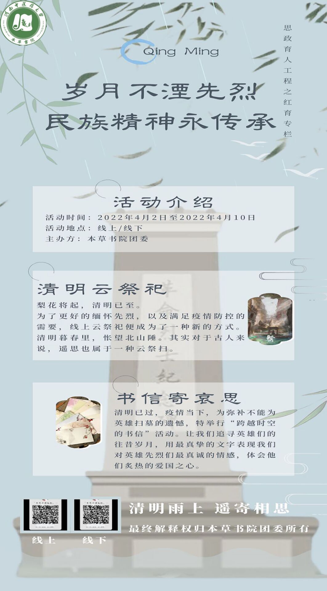 清明是中华民族悼念逝者、缅怀先人、寄托思念的传统节日,以清明节为契机,充分挖掘运用节日蕴含的爱国主义精神,引导书院学子学习历史、传承文化,缅怀先辈、向往未来,铭记革命先烈光荣事迹,倍加珍惜今天幸福生活,发扬民族精神和时代精神,树立热爱祖国、热爱人民、热爱中华民族的人生信念。