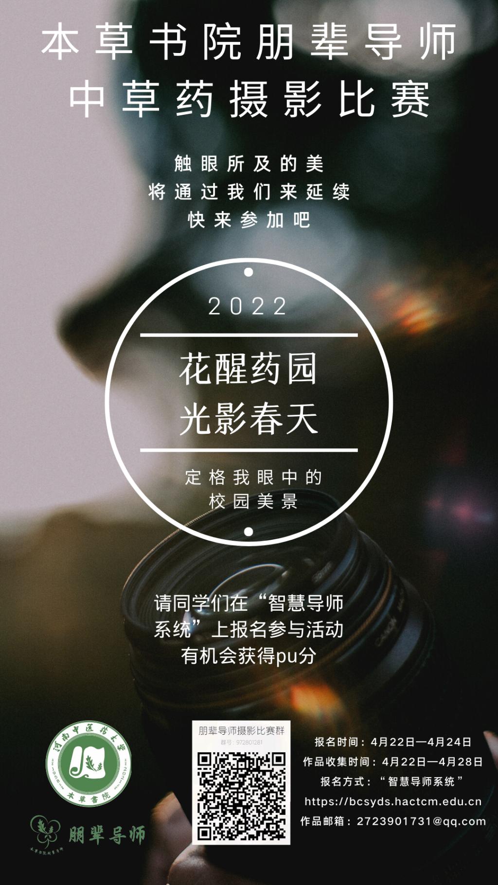 2022年4月22日-2022年4月28日收集作品,截至不在接收作品。提交的作品由摄影专业人士、学业导师代表、朋辈导师代表等评选。(具体评选方式请参考“花醒药园,光影春天”摄影比赛作品评选方式)
