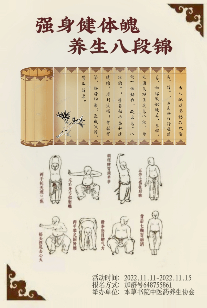 为了进一步传播和弘扬祖国源远流长、博大精深的中医药文化,增强同学们的免疫力,鼓励同学们养阴防燥,中医药养生协会特举办八段锦活动。