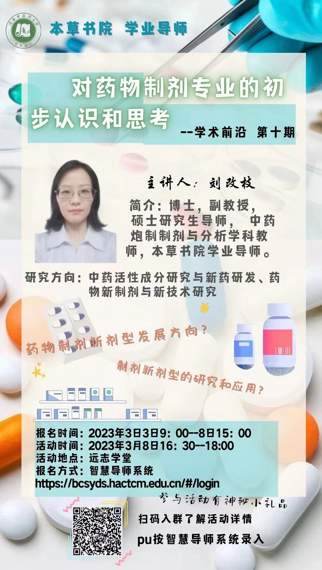 随着我国医药卫生事业的发展,社会对药品生产及管理人才的需求量越来越大,许多新药的开发离不开药物制剂知识的支撑。在生活中我们可以接触到许多药物制剂,那么药物制剂新剂型的发展方向是什么?有哪些制剂新技术正在研究或者已经应用到临床呢?为解答这些问题,学术前沿第十期我们邀请到了刘改枝老师为大家讲解。