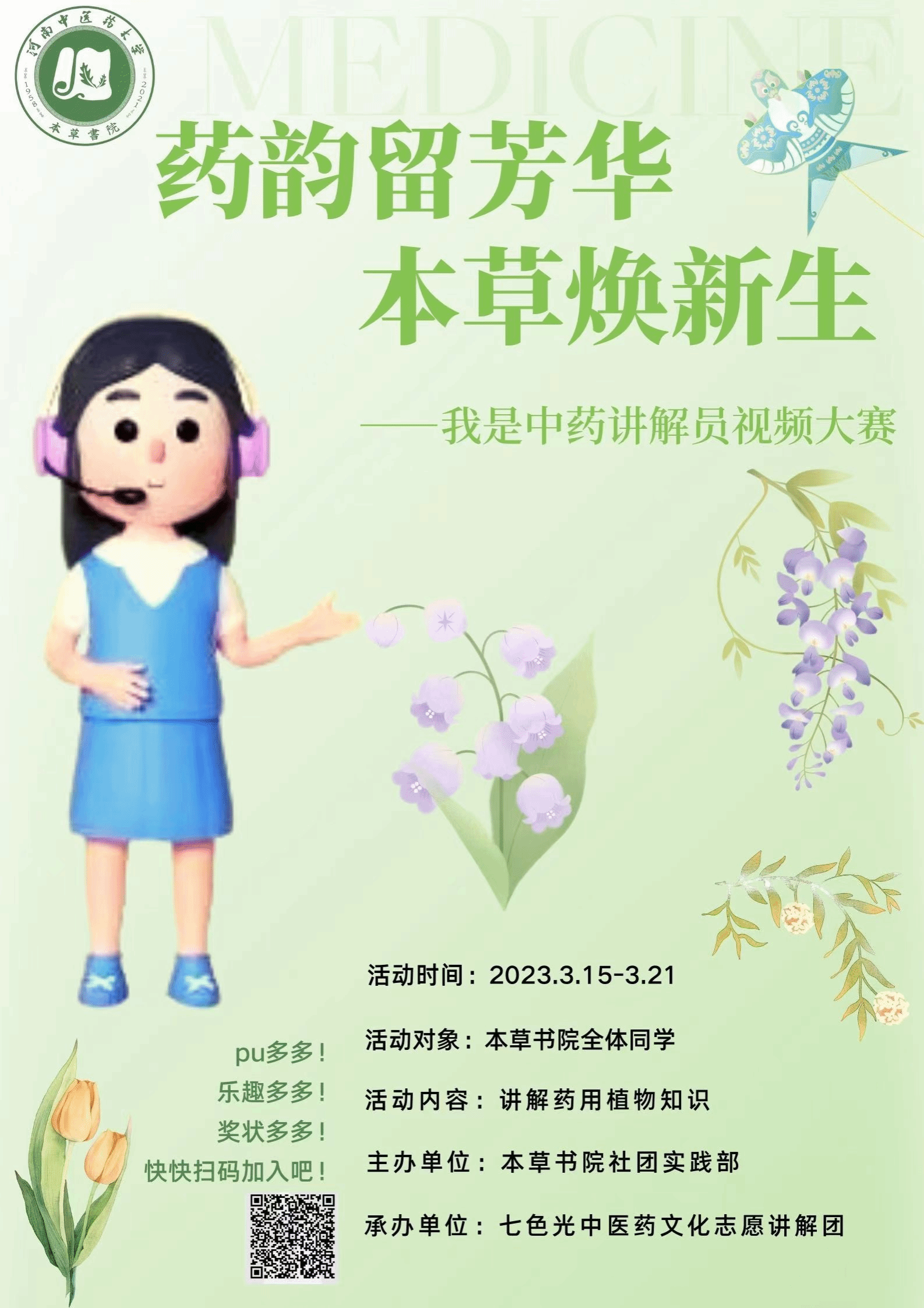 为弘扬传承中华优秀传统文化,进一步坚定文化自信,不断开拓创新,为开创党和国家事业发展新局面提供坚强思想保证和强大精神力量!我院社团实践部举办我是中药讲解员视频讲解大赛。