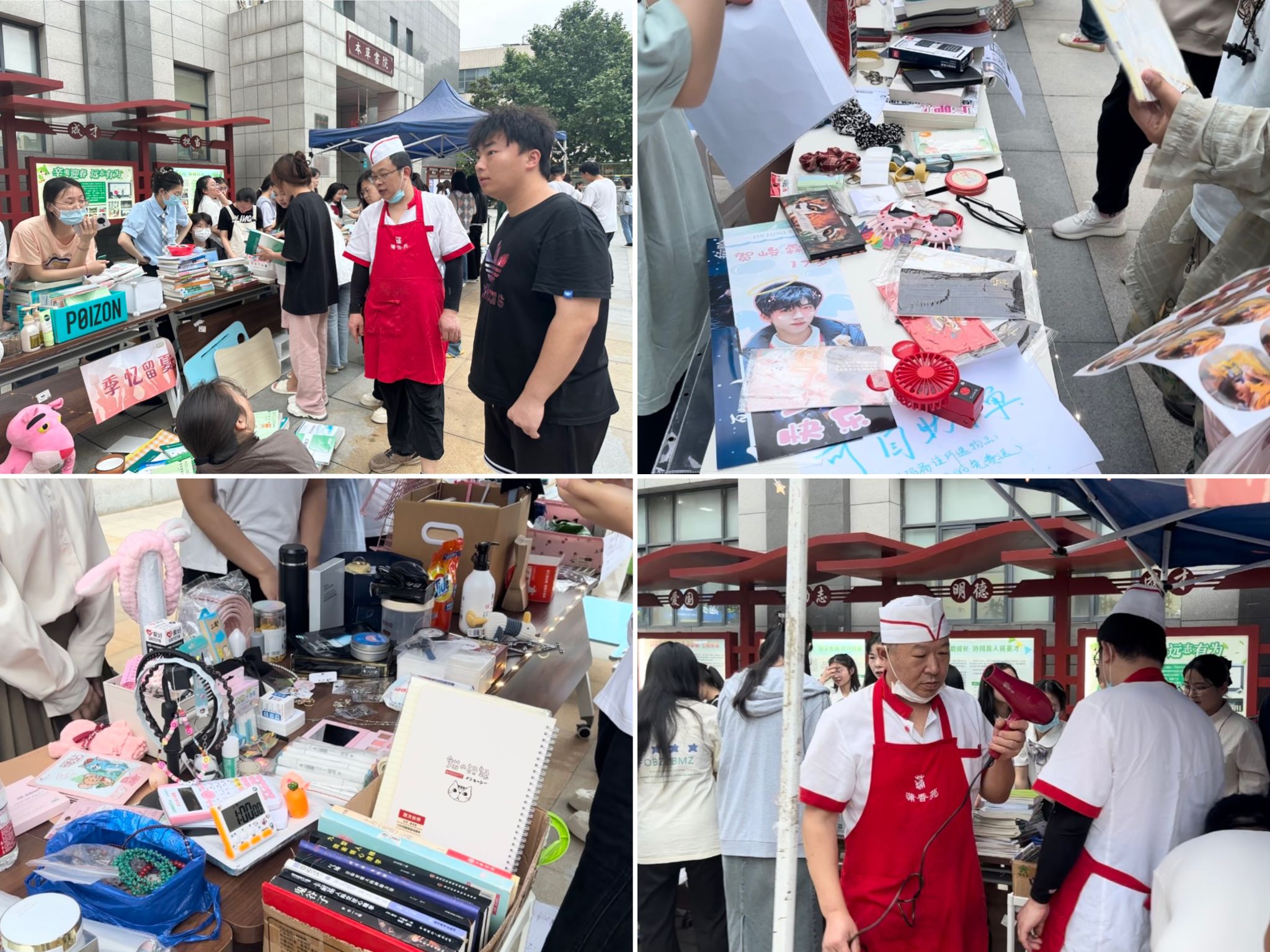社管会的工作人员早已忙碌起来,摆好桌椅,搭好帐篷,对各摊主及物品情况进行沟通、登记,为“开张”做足准备。紧接着,一个个摊位井然有序地排列开来,毕业生们持证上岗,纷纷摆出“藏品”,文创产品、学习资料、生活日用品、运动器材、手办玩偶、衣服化妆品……琳琅满目的物品令人目不暇接,前来“淘宝”的同学络绎不绝,现场人声鼎沸,十分热闹。