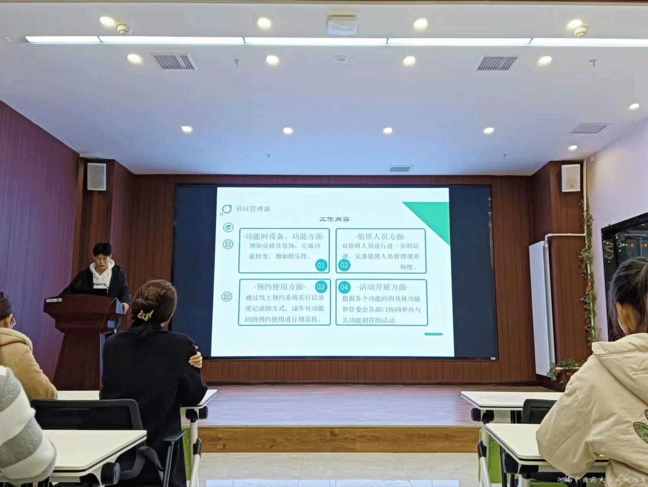 会议伊始,孟琳对社区管理委员会2022年的工作进行了总结,并提出2023年新学期社管会的工作思路,强调各部门要提前部署好工作,以全新面貌对待生活、学习和工作,希望大家在新的学期抓好学业的同时,出色地完成工作任务,平衡好工作与学习之间的关系。随后,各部门负责人或代表依次对各自部门负责的管理工作安排情况进行简要汇报,对新学期即将开展的各项重点工作、注意事项以及新增工作内容进行部署。最后,沈雪慧对社管会2022年工作取得的成绩给予充分肯定,并对全体成员提出四点要求:一是以身作则,做好表率,在学业和工作中发挥好先锋模范作用;二是统筹兼顾,做好协调,统筹协调好学习与工作、个人与团队之间的关系;三是主次分明,抓好重点,分清轻重缓急,优先完成重点工作;四是团结一致,做出成绩,全体社管会成员要加强团结,争取在各项工作中再创佳绩。