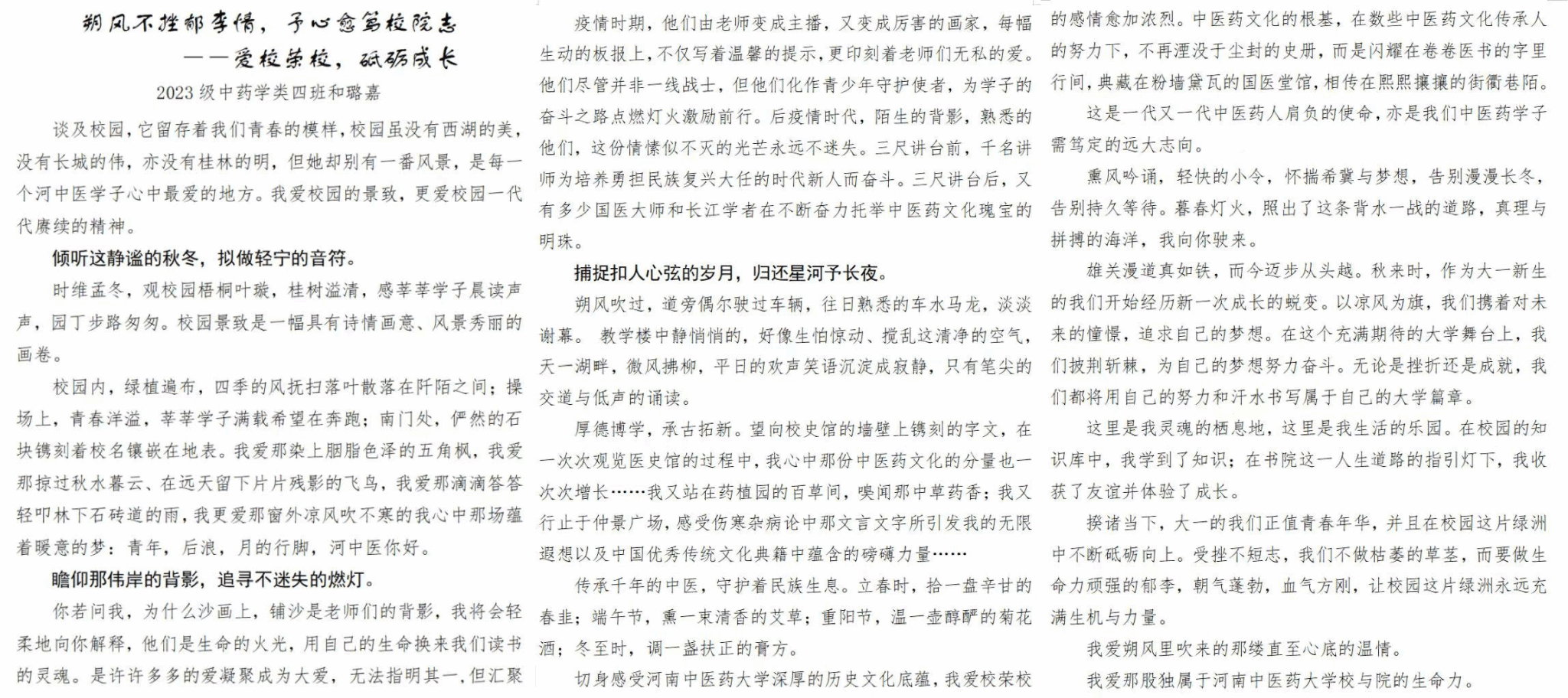活动期间,同学们相伴畅游校园,将所见之景和心中所感用文字呈现,词与词的碰撞、句子与情感的交融使学校悠然的景色和爱校爱院之感跃然纸上。每一份作品都展现出同学们百花齐放的写作风格和挥洒自如的文字功底,展现出同学们对校院的热爱,对未来的憧憬。2023级中药学类四班和璐嘉同学的《朔风不挫郁李情,予心愈笃校院志——爱校荣校,砥砺成长》凭借她细腻的笔触,清晰的逻辑和丰富的层次,既表达了初入校园的她对大学生活的期盼,也展现了她对学校对书院的热爱;2023级中药学类三班乔玉茹同学的《寄情河中医,圆梦新未来》以自己来到校园的每一次深入心扉的感受为线索串联起整篇文章,循序渐进带我们走进她眼中的美好校园,言语间满是欢欣与热爱。