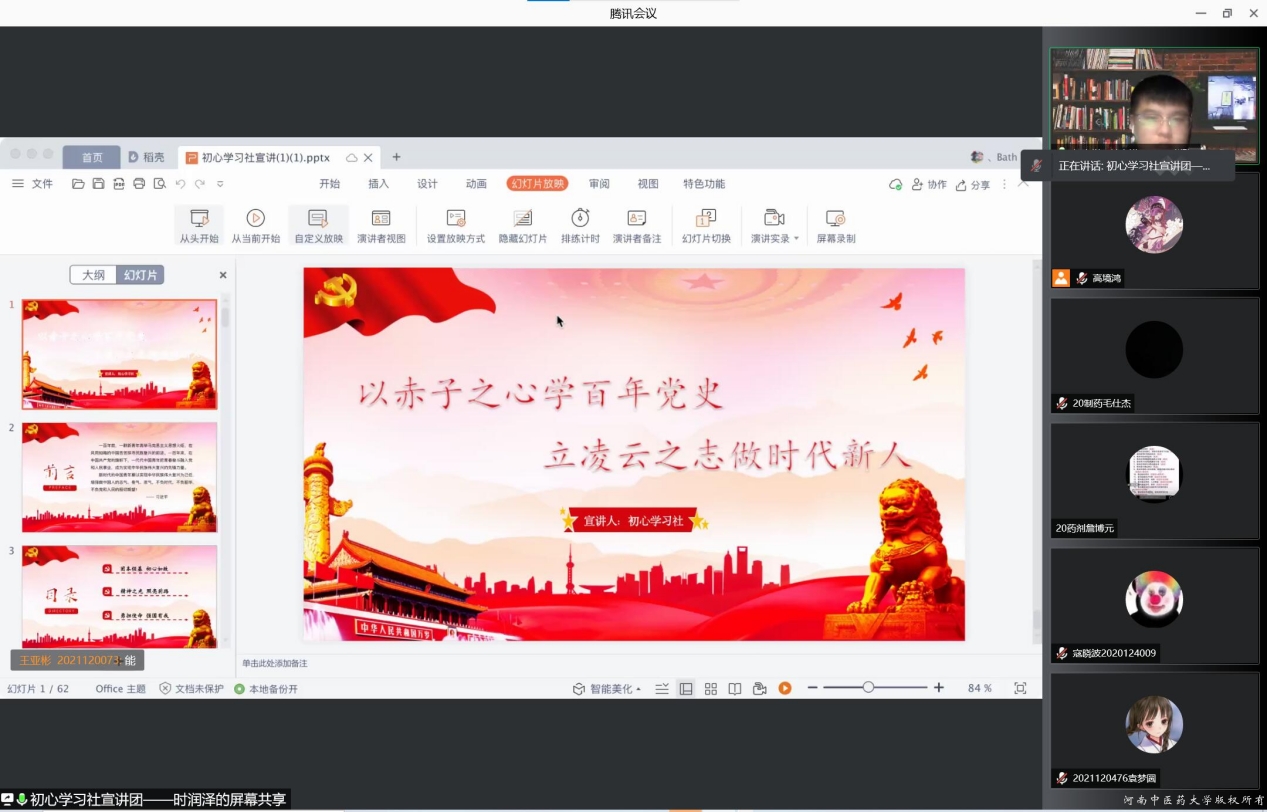 在此次宣讲活动中,马克思主义学院时润泽同学通过线上为同学们深入解读了习近平总书记“七一”重要讲话精神,全面阐述了学习党史知识的重要性,强调了青少年要树立“以赤子之心学百年党史,立凌云之志做时代新人”的时代精神。在理论宣讲环节,他讲解了“人无精神则不立,国无精神则不强”的内涵与新时代背景下的具体呈现,号召当代青年放眼世界,自觉肩负命运与共的道义担当,与世界积极力量一道和衷共济、勠力同行。同学们认真学习,积极回应,学习态度端正,学习氛围浓厚。