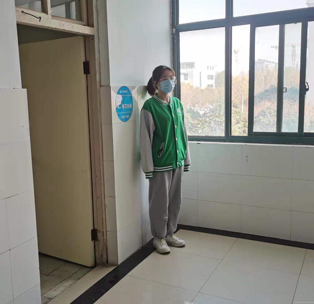 志愿者左亚鑫正在卫生间门口执勤,防止同学们向卫生间倾倒垃圾