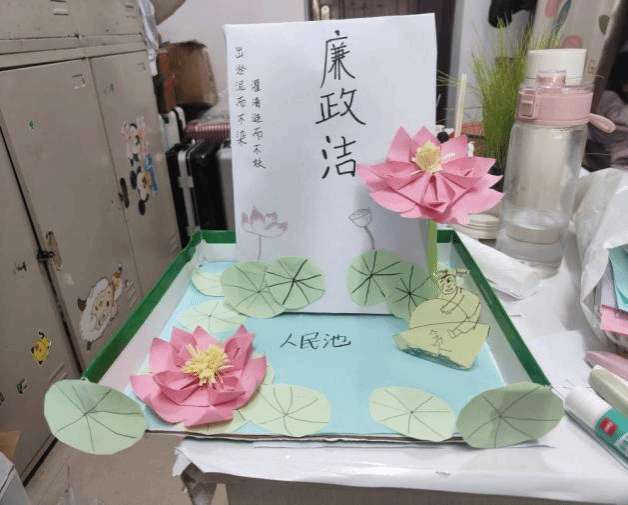 活动期间,同学们围绕“廉”这一主题,通过绘画、摄影、书法、雕塑和漫画等形式加以创作,或对清正廉洁精神的歌颂,或对腐败现象进行批判,多样的形式、多元的视角和巧妙的创意将同学们对廉政的内涵展现的淋漓尽致。其中,2023级计算机类二班贾宛榆同学的《廉洁人民池》书画作品创意新颖,莲花象征“出淤泥而不染”,莲花盛开于人民的池塘,寓意人民是国家的主人,只有廉洁正气才能更好地全心全意为人民服务,整个作品主题明确,各种元素互相映衬,赢得了评委的一致好评。