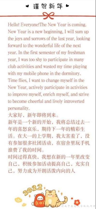 在春节前夕,同学们通过视频或音频的方式用英文记录下自己对2021年的回顾和对2022年的展望。同学们以不同形式的作品体现出了对英语学习的热情,愈加标准化的口语发音更是直接反映出社团在上年度口语纠音活动的成果。其中,来自2021级中医儿科学本科班的张盼盼同学在作品《岁岁年年》中,用流利的口语描述了初入河中医的欢喜以及对未来美好生活的期待,荣获本次比赛一等奖。