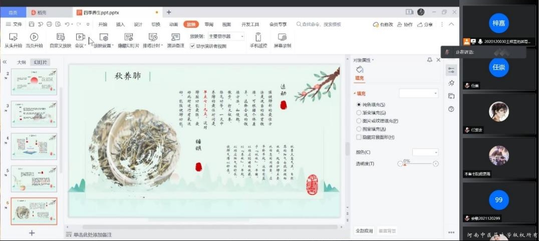 本网讯(文/胡春月,史一彪 图/李志华)为加强中医药养生协会成员对中医药养生知识的了解,深刻认识保持身体康健的重要性,中医药养生协会于2022年4月9日举办“观四时养生,保五脏康健”线上养生知识分享活动,共有63名成员参与此次活动。