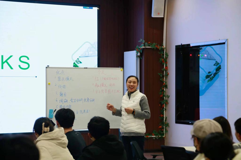 在分享会上, “沉浸式中医药文化体验馆”、“知行教育—双轨并行开辟融合育人新模式”等六个项目小组的汇报人依次上台进行展示与汇报。项目准备前期,项目成员之间在不断的头脑风暴中,激发了创新性思维,迸发出灵感的火花;在两周的项目打磨过程中,队员们积极调研、分析市场容量、对标客户群体、创新运行模式,最终在分享会上进行了全面的展示。会上,胡春月针对每组的优缺点进行了详细分析,并对各个项目提出了个性化建议;引导同学们在项目打磨过程中,要查漏补缺,抓住核心要义,以评委的眼光审视项目的优劣势;