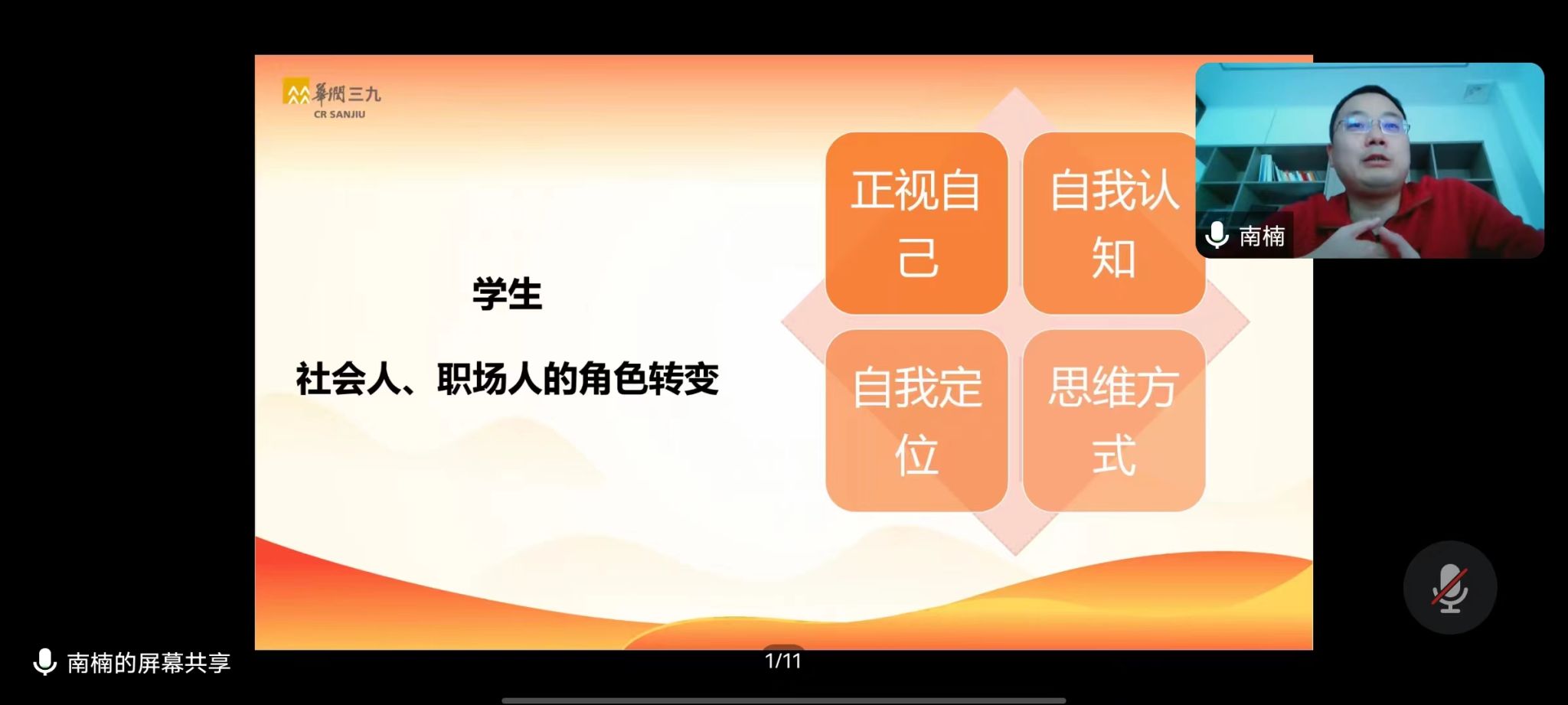 于2023年11月17日举办“律动青春,勇往‘职’前”云宣讲活动,邀请实践就业基地深圳华润三九医药股份有限公司,企业导师南楠为低年级学生开展生涯规划讲座,本次活动由双创孵化中心主任高巍主持,职业生涯发展协会承办。
