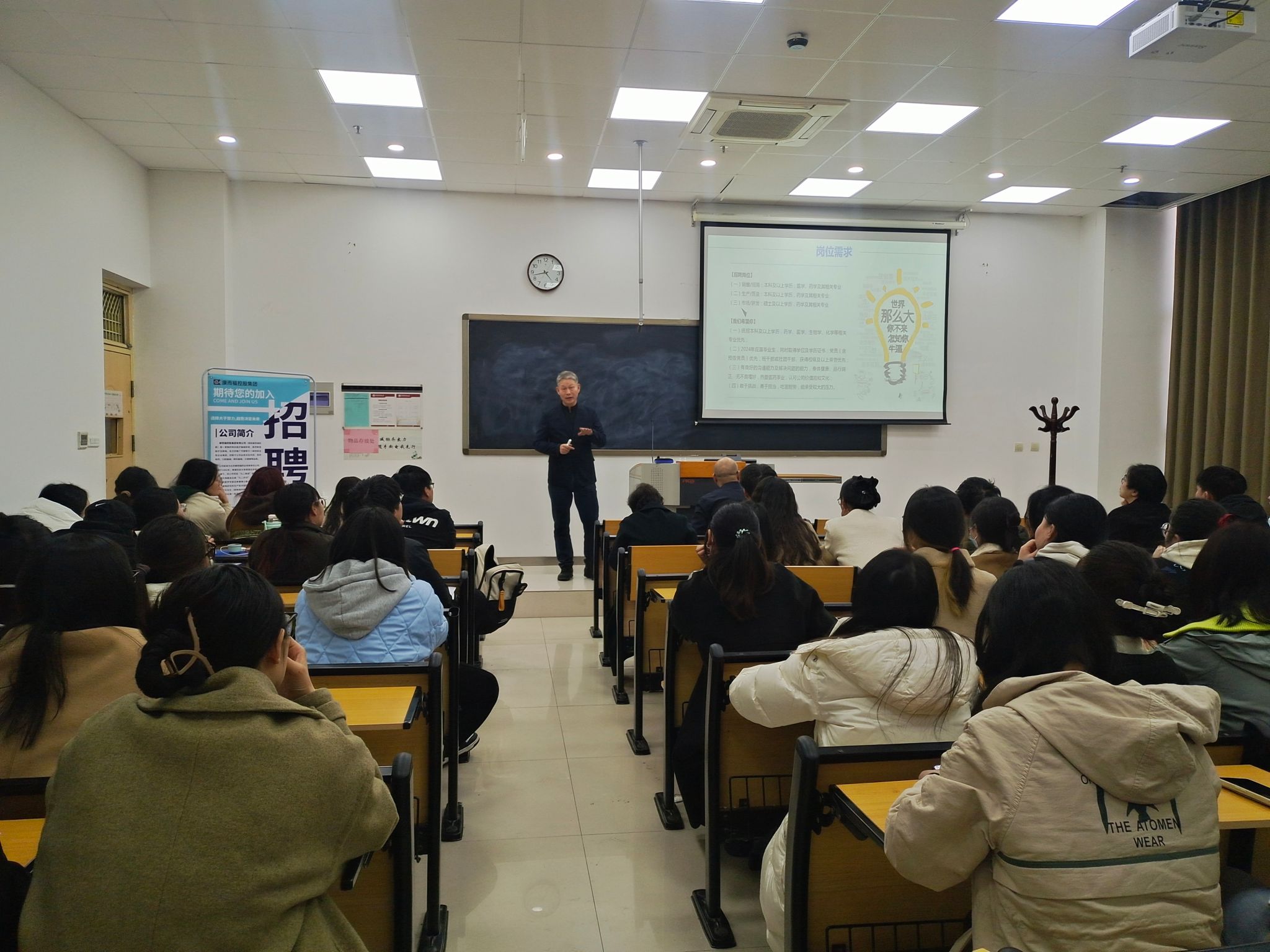 邀请北京康而福控股集团董事长宋明远先生为高年级学生做就业指导讲座。宋明远通过自身求学和就业经历,告诫同学们要不断努力、勇于实践,并充满自信,在实践中提升个人能力。在学期间要做好求职准备,学会获取就业资源和信息。最后,举行专场招聘会,同学们就自己心仪的岗位投递简历。现场气氛热烈,同学们积极与招聘人员沟通交流。