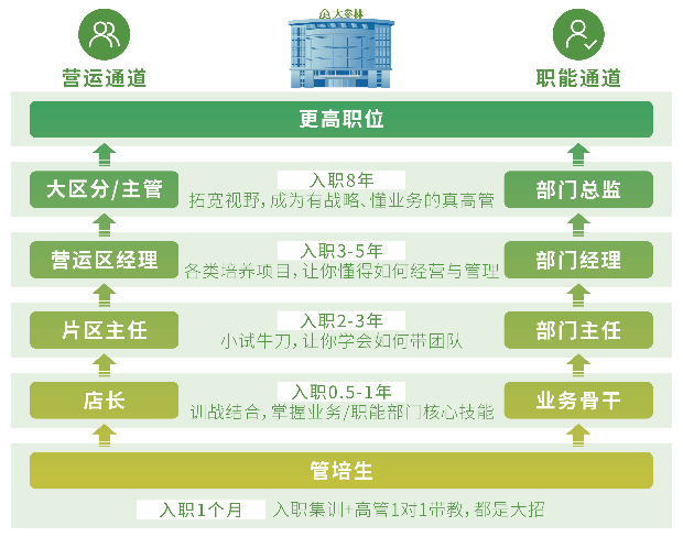地区:管培生→店长→片区主任→营运区经理→大区(分管)主管→更高职位