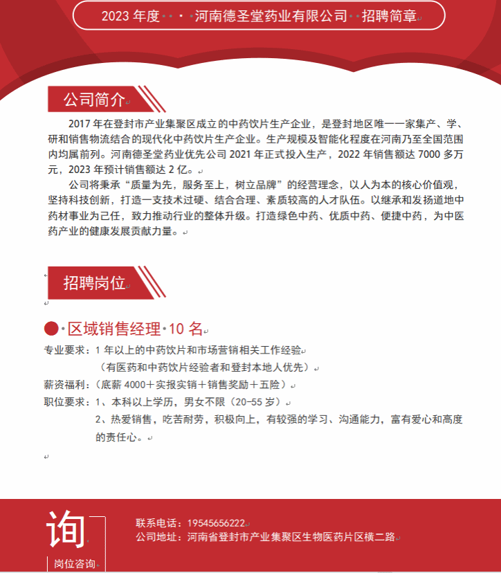 【招聘】河南德圣堂药业有限公司