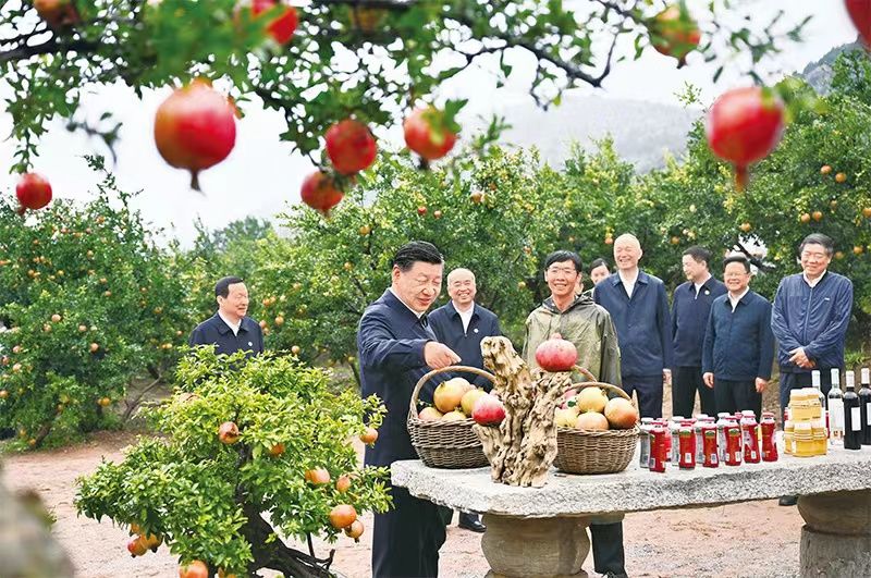 2023年9月24日,中共中央总书记、国家主席、中央军委主席习近平在浙江考察结束返京途中,来到山东省枣庄市考察。这是习近平在位于峄城区的冠世榴园石榴种植园了解石榴产业发展情况。新华社记者 燕雁/摄