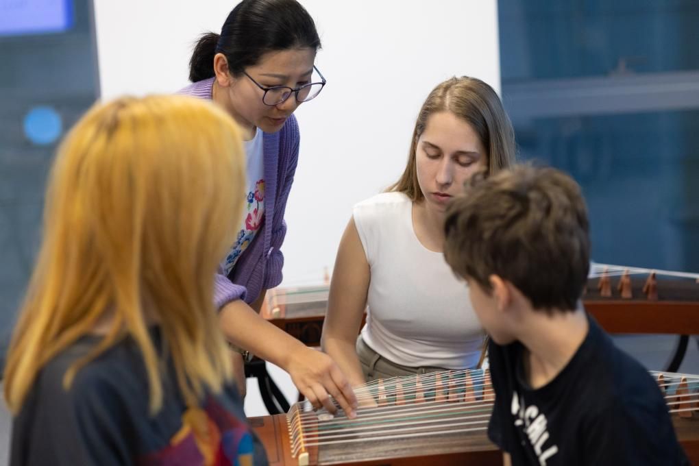 4月29日,在塞尔维亚贝尔格莱德中国文化中心,古筝指导老师王宣(后左)在教学。新华社记者 李京 摄