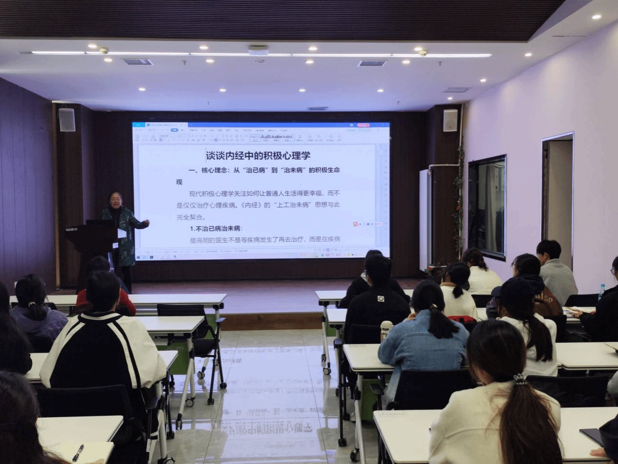 本次活动聚焦《黄帝内经》中的积极心理学这一主题展开多方面交流。王宪龄教授从“治未病”的积极生命观切入,阐释“养生即养心”的核心理念,解析《素问·上古天真论》“恬淡虚无,真气从之”的古训智慧,传授减欲存真、守神养心的情绪培育之道;围绕优势品格、情绪管理调节以及积极人际关系与社会角色等关键议题,详解“圣人”之德、五行情绪调节模型、“高下不相慕”等经典智慧的现代应用。参与者通过分享交流,深入领会内经智慧,真切感悟传统中医与积极心理学融合的深层价值。同学们纷纷表示,此次分享打破了固有认知,对其中蕴含的心理学智慧有了全新理解,更收获了诸多调节心态、经营生活的方法。