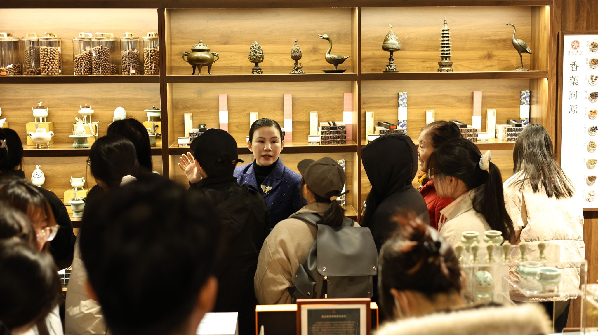 活动伊始,师生一行率先走进远山香局非遗文化展厅。展厅内陈列的各类纯手作香品琳琅满目,以中药材为核心配方的香牌、手串等香气醇厚,兼具养生功效与艺术价值,蕴含传统美学理念。同学们驻足观赏,在视觉与嗅觉的双重体验中,初步感知中医药与传统香文化的紧密关联。